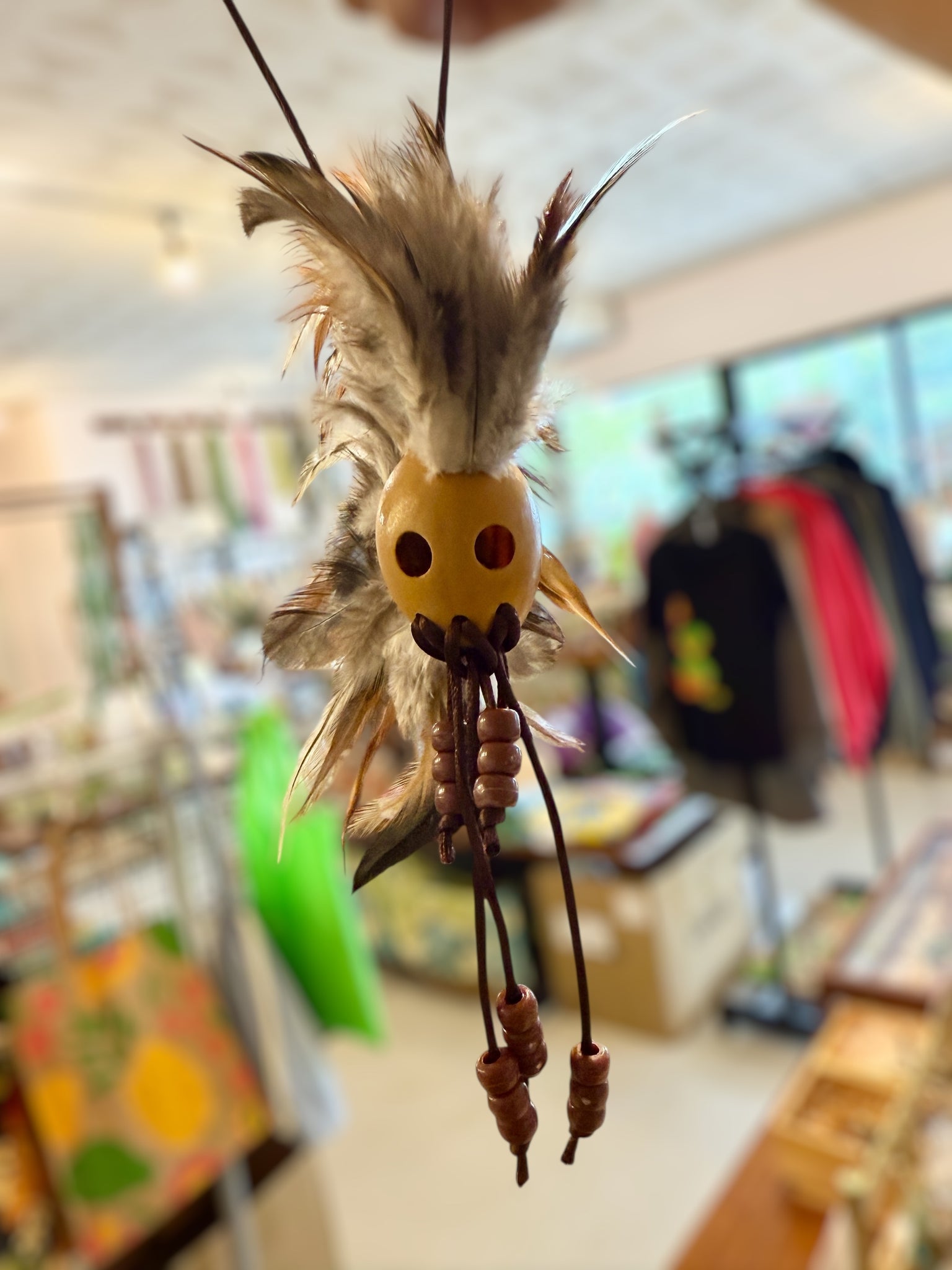このレプリカヘルメットには魔除け・願いが叶うと言われている本物の羽を使っています。